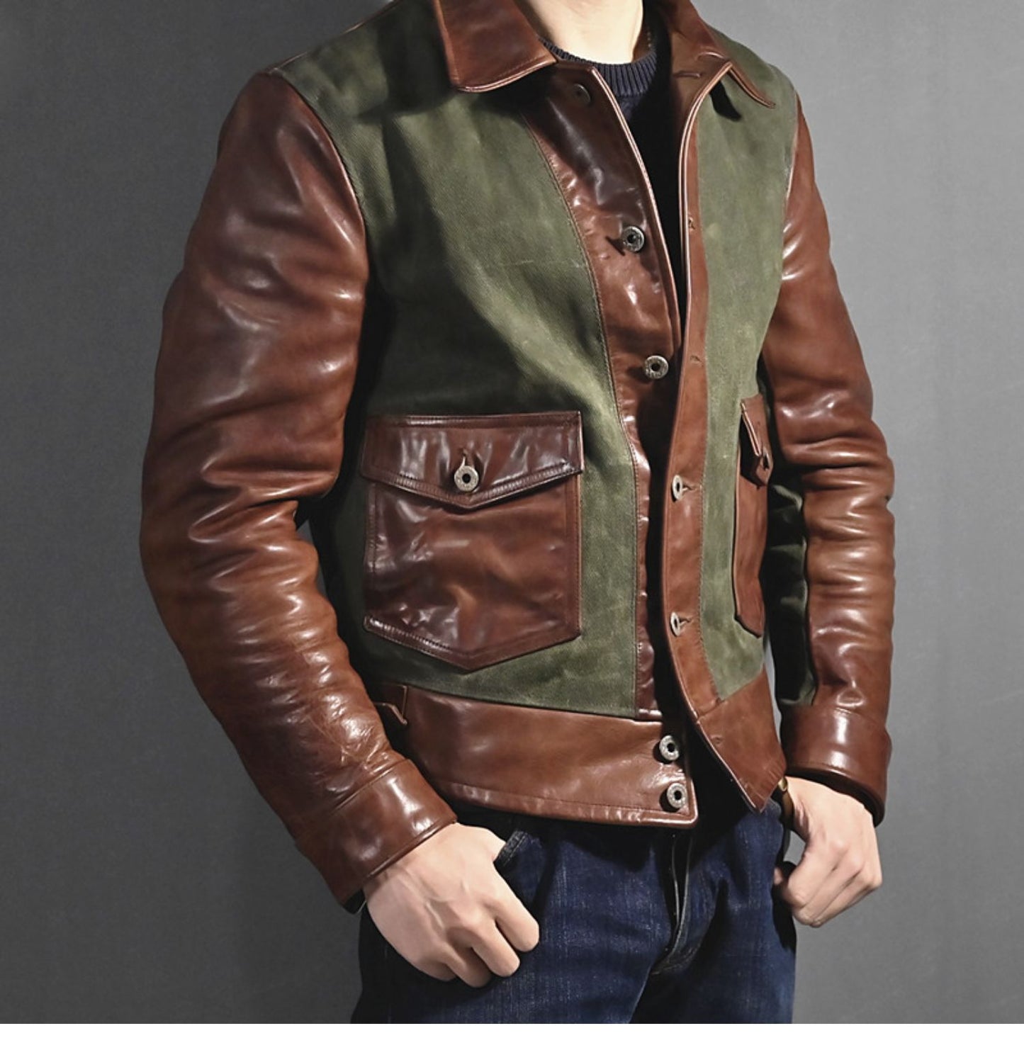 絶妙なヴィンテージ加工で雰囲気ある仕上がりに◇オイルドホースレザー×コットン帆布 切替 レザージャケット◇M~3XL